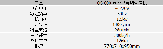 QS-600 豪华型食物切碎机是我公司精心设计和制造的食品机械,该产品可以将肉、瓜果、蔬菜等在料盘内通过一组高速旋转的切刀进行反复循环切削。快速使食物切碎切细,实现用户所需的用材和馅料(如饺子馅等)。本系列设备有座地式和台式可供选择。产品性能稳定、结构合理、操作方便,易于清洁,外形美观高雅;具有占地小,生产效率高的特点,代替传统落后的手工切削制作,是食品加工企业加工食物馅料的理想设备。