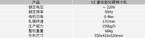 YZ 豪华型甘蔗榨汁机是我公司研制的高效率电动榨汁机,产品具有外形豪华、结构紧凑、稳固耐用、操作方便、出汁快、榨汁力强等优点;外壳和榨汁仓均采用不锈钢制作,符合国家卫生安全标准,适合宾馆、超市、商场、商店等各类型场所现榨现饮之用。 · 操作维修更加方便。 · 造型美观、工作效率高。 · 铝合金或不锈钢制作,符合国家标志。 点击观看操作视频 产品参数 产品视频
